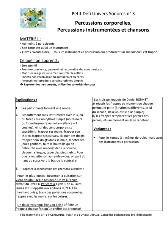 Petit Défi 3 Percussions Corporelles Et Sonorisation De 3 Chansons Jp Cerbonne